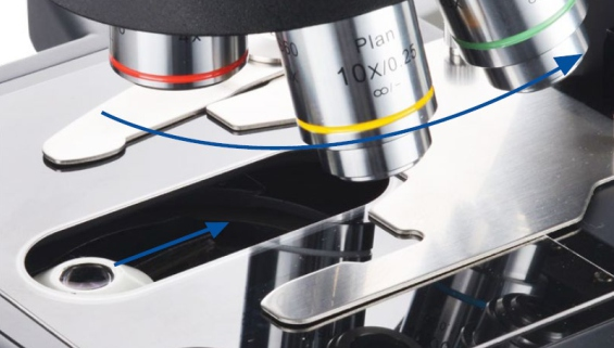8. 载物台:双层复合式机械移动载物台;载物台尺寸不低于180X170(mm),移动范围不低于80X55(mm);采用三角钢导轨;高抗磨损性陶瓷覆盖层载物台。片夹可夹2片生物切片并自由装御;无突出齿轮齿条结构确保安全;具有重复定位功能,即更换切片调整载物台高度后可快速定位回之前位置。右手低位置同轴驱动旋钮,载物台X、Y向调节旋钮力度大小可根据使用需求设定。